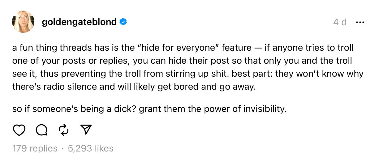This is absolutely fascinating, and what it says to me is that the Threads team, led by Adam Mosseri, is taking the problem of moderation very seriously and at the same time, putting it into the hands of the users. “Hide for everyone” really is smart. Sure, Twitt—X has it, and has had it for a long time. That’s because Twi—X has been around for ages. But what we’re looking at here is the priorities of the network, as exposed by the choices made by the design team.